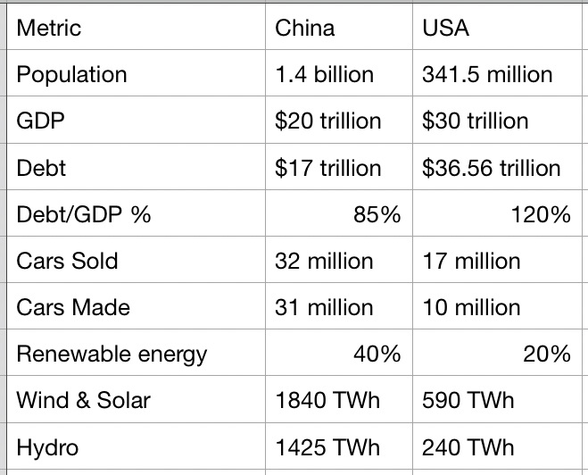 This along with the huge pollution problems have led China to take the climate crisis seriously and to take big steps to transition their economy to a renewable economy. Meanwhile America grasping as its accelerating collapse gathers momentum, is going back to investing heavily in fossil fuel infrastructure and wantonly pillaging its own natural resources. China’s economy is already vastly more efficient in real terms than America.