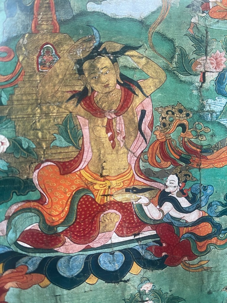 Whether they meet in a marketplace or a crossroads, it is this woman’s intense concentration and spiritual instructions to Saraha that are transformative. When he finds her, Saraha inquires about what she is doing. Her reply to him is pith and direct: “The Buddha’s meaning can be known through symbols and actions, not through words and books.”[8]